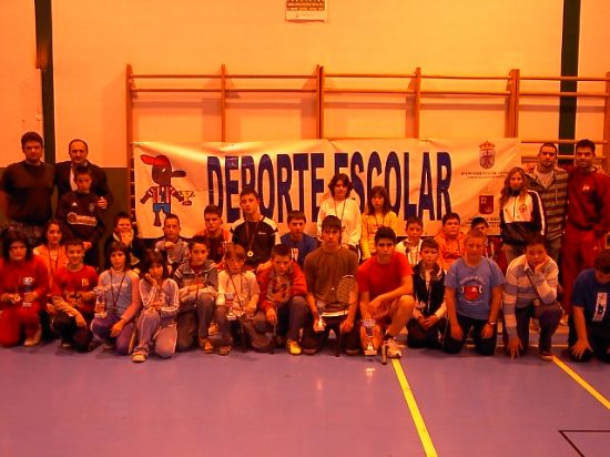 En la categoría alevín individual masculino, el campeón fue Sergio Bravo, del Colegio La Milagrosa, mientras que en modalidad femenina, Marina Pérez, del Colegio Santa Eulalia, obtuvo el primer puesto. En la categoría infantil masculino, finalizó en el primer puesto Miguel Cánovas, del IES Juan de la Cierva. Y en la modalidad de dobles, la pareja formada por Antonio García y Juan López, del Colegio Comarcal Deitania, obtuvieron el primer puesto, en la categoría alevín masculino; mientras que en la categoría alevín femenino, la pareja ganadora estuvo formada por Marina Pérez y Ruth Andreo, del Colegio Santa Eulalia. Por último, en la categoría infantil, finalizaron campeones la pareja formada por Juan Daniel Sánchez y Juan Bautista López, del IES Prado Mayor e IES Juan de la Cierva respectivamente.