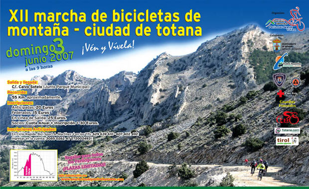 Esta XII edición de la marcha ciclista, organizada por la Peña Las Nueve de Totana, cuenta con la colaboración de la Concejalía de Deportes, Ciudad Deportiva Sierra Espuña, Policía Local de Totana, Protección Civil, Cruz Roja, Guardias Forestales, la Federación Ciclista de la Región de Murcia y el portal de comunicación Totana.com, entre otros, así como con la aportación de medio centenar de empresas del municipio.