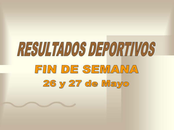 28/05/2007 RESULTADOS DEPORTIVOS (28/05/2007) Fuente: Concejalía de Deportes Fin de semana 26 y 27 de mayo Comentar RESULTADOS DEPORTIVOSFin de semana 26 y 27 de mayo