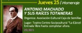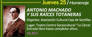 El municipio de Totana realizará un homenaje a “Antonio Machado y sus raíces totaneras” con un recital de poesía que correrá a cargo de la Asociación cultural “Caja de Semillas” de la localidad, que se celebrará mañana jueves 25 de marzo a las ocho y media de la tarde en el Centro Sociocultural “La Cárcel”.
