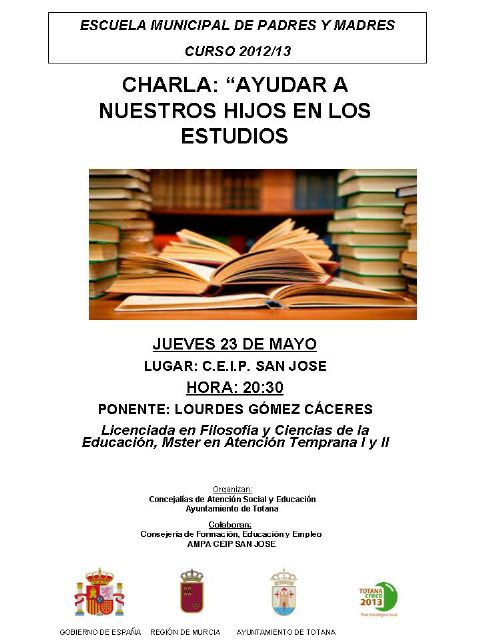 El programa Escuela Municipal de Padres y Madres celebra este jueves, día 23, la charla "Ayudar a nuestros hijos en los estudios" en el CEIP "San José", y estará a cargo de Lourdes Gómez Cáceres, licenciada en Filosofía y Ciencias de la Educación.