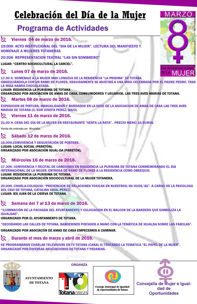 También el día 16 será la convivencia y recital de canciones en la residencia "La Purísima" para conmemorar el "Día de la Mujer", a cargo de la Asociación Sociocultural de la Mujer Totanera (17:30 horas).
