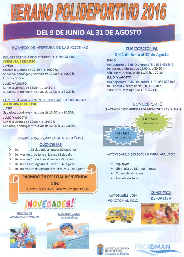 El programa “Verano Polideportivo´2016”, que incluye el Campus de Verano para niños y actividades variadas para adultos, tendrá lugar en el Polideportivo Municipal “6 de Diciembre” y en el Complejo Polideportivo “Guadalentín” de El Paretón durante la última semana de junio, y los meses de julio y agosto.