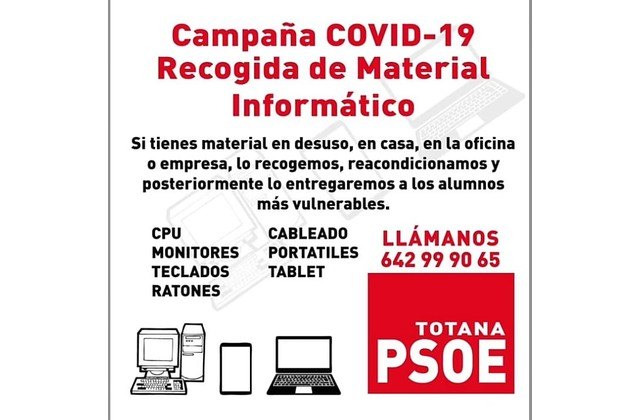 "Moción URGENTE de Acción Totana solicitando el apoyo de toda la oposición por ser mayoritaria en esta Corporación Municipal, para aprobar un plan conjunto y una partida presupuestaria, en coordinación con los colegios del municipio sean públicos o concertados, los comercios locales y las posibles donaciones de particulares en dinero o material para dotar a todos los escolares del municipio que no los tengan, de equipos informaticos básicos que les permitan seguir sus estudios durante el tiempo que dure el mal llamado estado de alarma para que posteriormente, queden a disposición y en depósito de los alumnos de cada centro escolar".