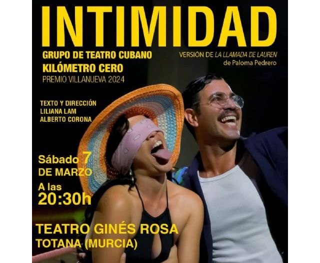 Los dos grandes actores de la escena ALBERTO CORONA, muy reconocido por series de máxima audiencia en Iberoamérica y LILIANA LAM con un gran bagage interpretativo con grandes premios a su espalda, llegan con su espectáculo "INTIMIDAD", versión de "LA LLAMADA DE LAUREN" de PALOMA PEDRERO a nuestra Región, en esta ocasión tendrán oportunidad de disfrutar de esta comedia reflexiva que habla de la deconstrucción del hombre en clave comedia este próximo sábado en Totana.