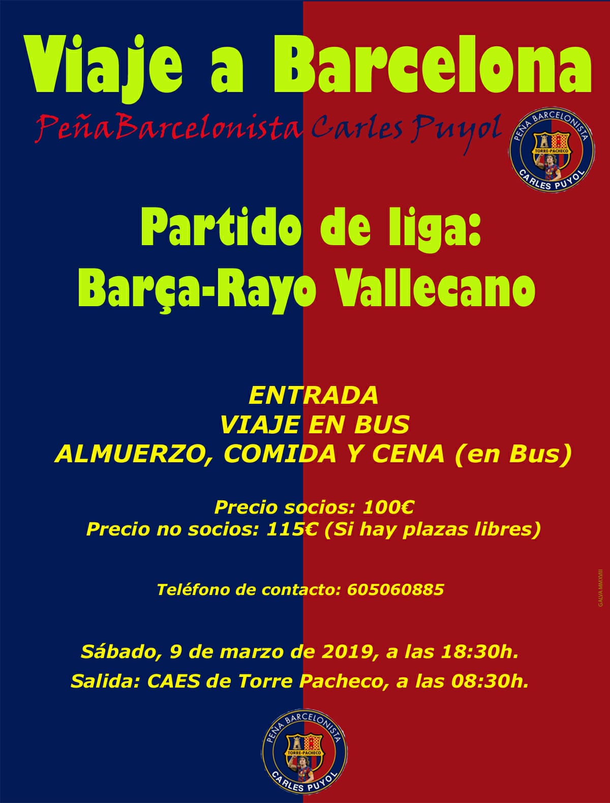 21/02/2019 VIAJE AL PARTIDO FC BARCELONA - RAYO VALLECANO Está organizado por la Peña Barcelonista Carles Puyol, de Torrepacheco, y tendrá lugar el sábado 9 de marzo.Toda la información relativa a este viaje está incluida en el siguiente cartel. Los interesados han de contactar directamente con la Peña organizadora.