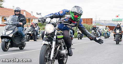 Los motoristas solidarios salieron desde la Plaza Diez de Revenga de Murcia con dirección a Mazarrón, tras pasar por Alcantarilla, donde realizaron exhibiciones ante los vecinos y desayunaron, así como por Alhama y Totana, donde fueron recibidos desde el balcón del ayuntamiento por el alcalde, Juan José Cánovas, donde también hubo un homenaje al motero.